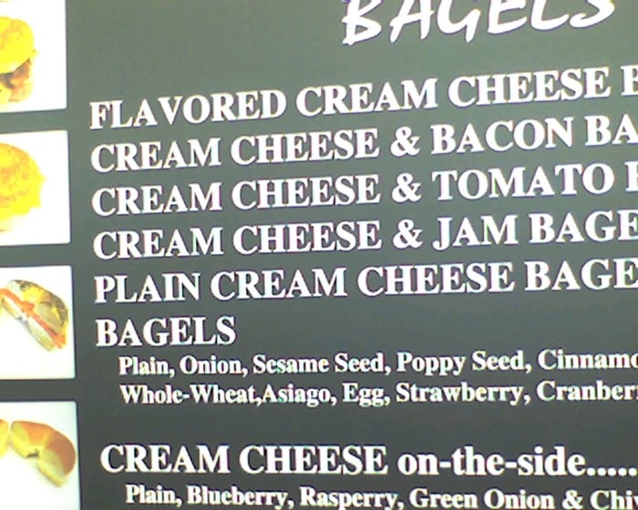 Your choice of flavored cream cheese. Flavored Cream Cheese: Blueberry, Raspberry, Green Onion & Chive, Garden Veggie, Sun Dried Tomato, Basil.